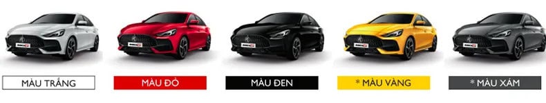 Với các phiên bản STD và LUX, người dùng có thể lựa chọn giữa 5 màu sắc nổi bật bao gồm Đỏ, Đen, Vàng, Trắng và Xám. Mỗi màu sắc đều mang một vẻ đẹp riêng, từ sự mạnh mẽ của màu Đen, năng động của màu Đỏ, đến sự tinh tế của màu Trắng hay cá tính của màu Vàng. Trong khi đó, phiên bản New MG5 1.5L MT cũng sở hữu 5 màu sắc không kém phần hấp dẫn: Trắng, Đen, Bạc, Đỏ phù hợp với những ai yêu thích sự cổ điển hoặc muốn tạo điểm nhấn khác biệt.